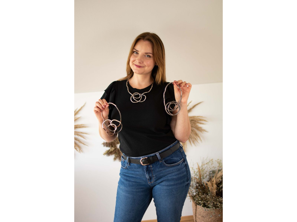 Délka náhrdelníku je 90 cm a průměr 0,5 cm. Náhrdelník je vyroben ze železa, které je pokoveno barevným kovem. Materiál není vhodný pro alergiky na kovy.