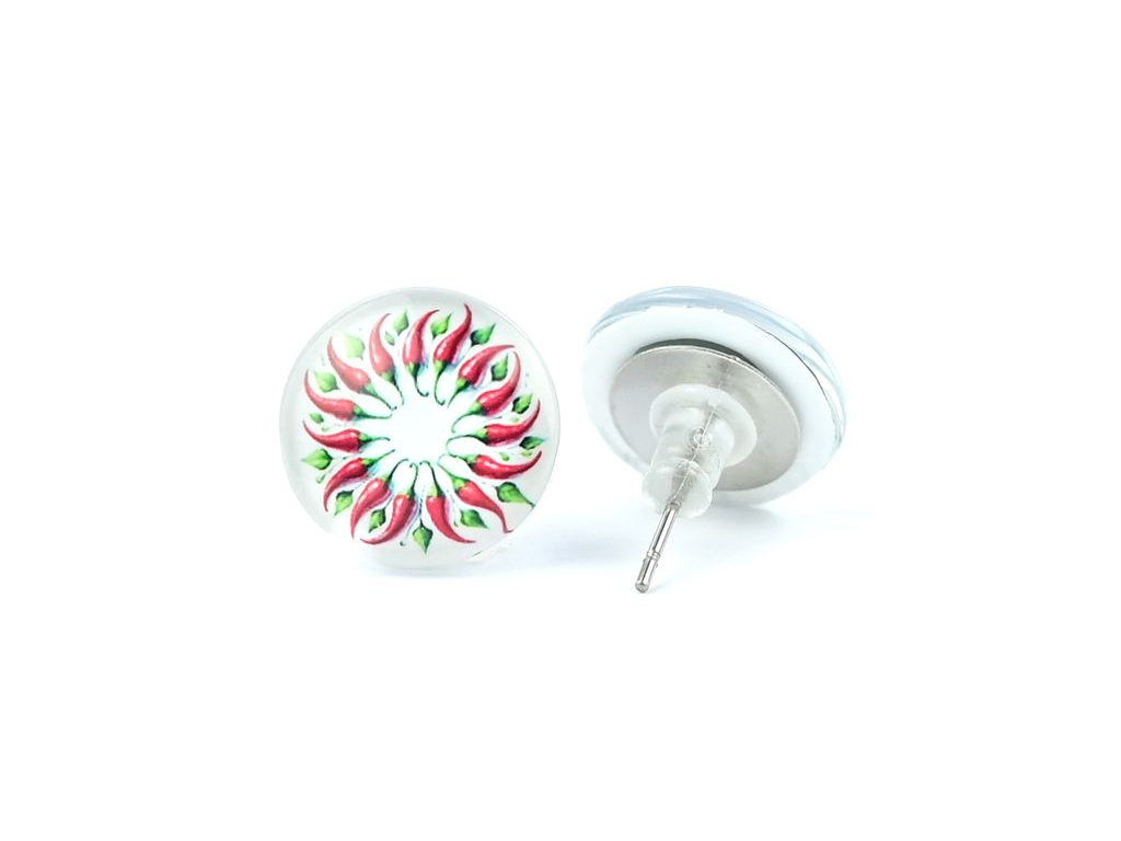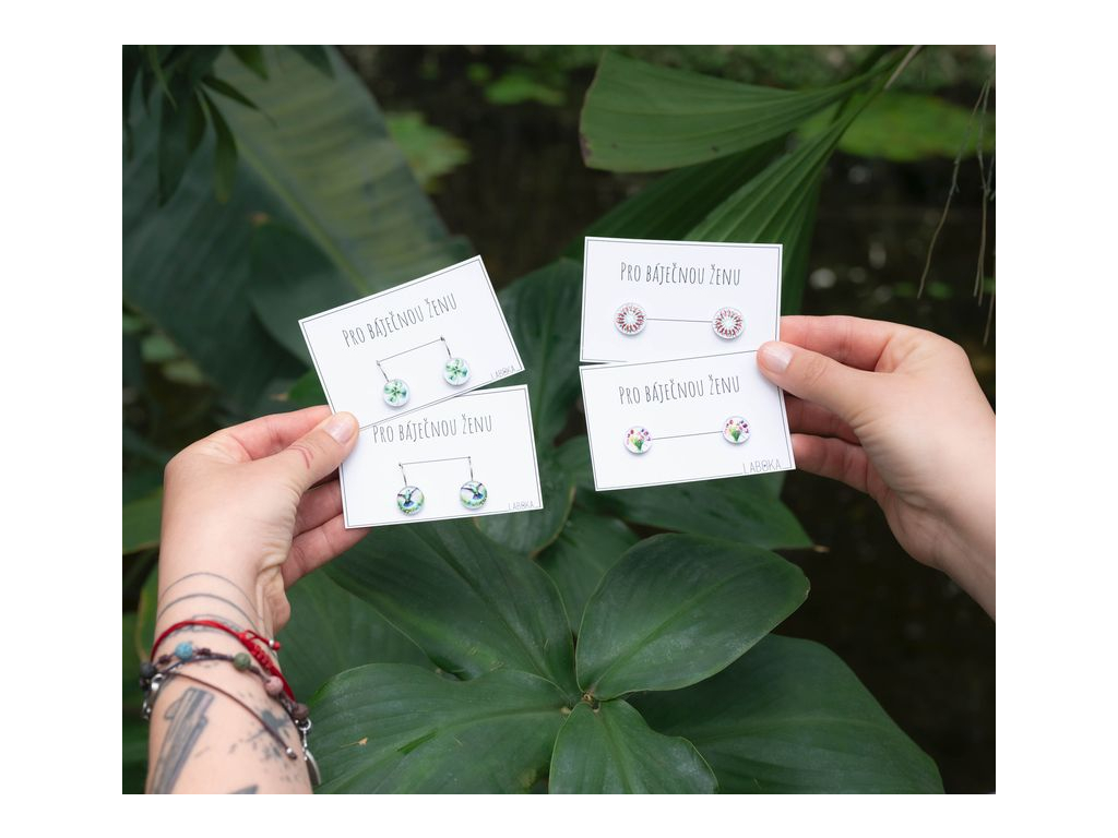 Náušnice jsou ručně vyráběné v České republice, konkrétně ve Středočeském kraji. Jsou tvořené skleněným kabošonem, pod kterým je pečlivě nalepený motiv. Puzeta, vyrobená českou firmou z chirurgické oceli 304 L, je vhodná pro většinu alergiků na kov. Na výběr máte ze dvou průměrů, které si můžete zvolit. Zapínání je ze silikonové zarážky, kterou vidíte na obrázku.