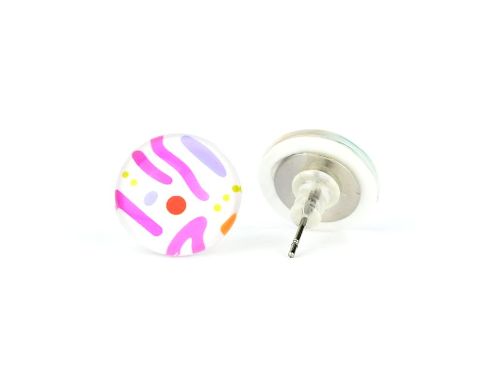 Náušnice jsou ručně vyráběné v České republice, konkrétně ve Středočeském kraji. Jsou tvořené skleněným kabošonem, pod kterým je pečlivě nalepený motiv. Puzeta, vyrobená českou firmou z chirurgické oceli 304 L, je vhodná pro většinu alergiků na kov. Na výběr máte ze dvou průměrů, které si můžete zvolit. Zapínání je ze silikonové zarážky, kterou vidíte na obrázku.