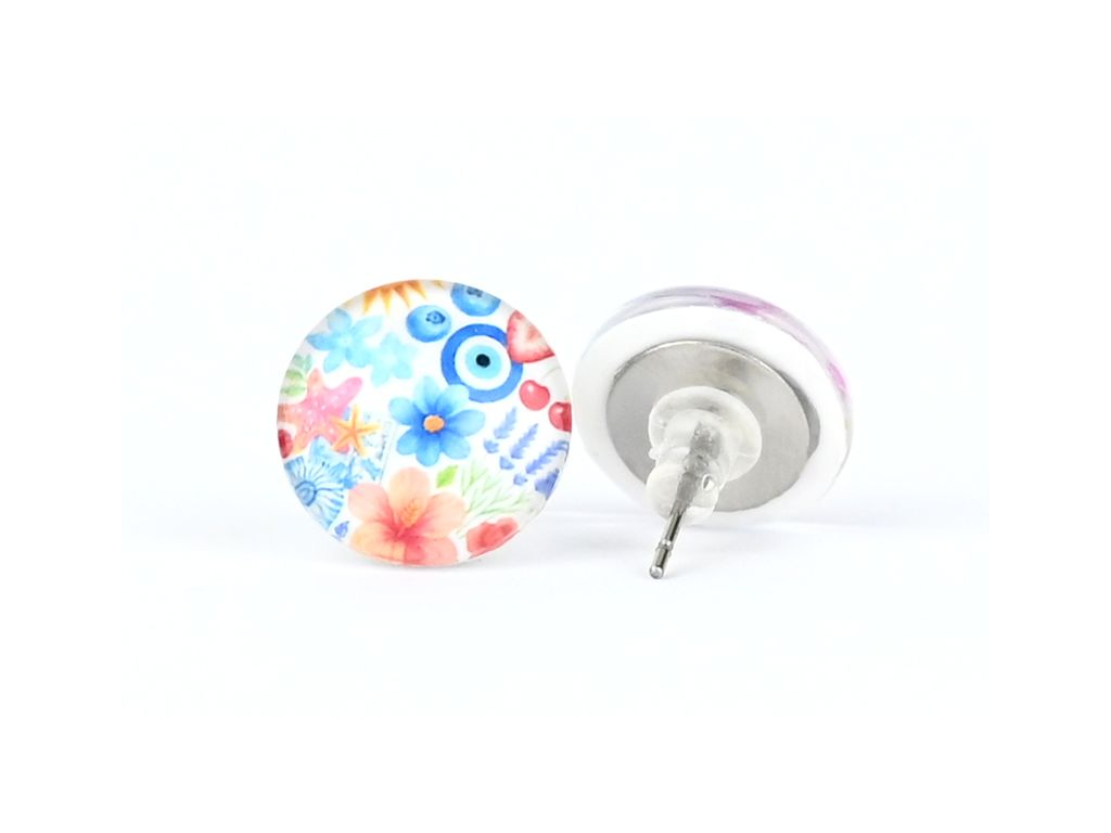 Náušnice jsou ručně vyráběné v České republice, konkrétně ve Středočeském kraji. Jsou tvořené skleněným kabošonem, pod kterým je pečlivě nalepený motiv. Puzeta, vyrobená českou firmou z chirurgické oceli 304 L, je vhodná pro většinu alergiků na kov. Na výběr máte ze dvou průměrů, které si můžete zvolit. Zapínání je ze silikonové zarážky, kterou vidíte na obrázku.