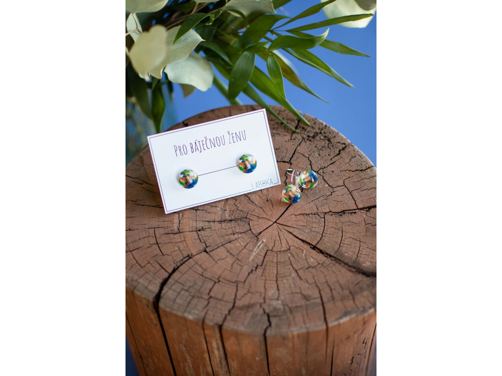 Náušnice jsou ručně vyráběné v České republice, konkrétně ve Středočeském kraji. Jsou tvořené skleněným kabošonem, pod kterým je pečlivě nalepený motiv. Puzeta, vyrobená českou firmou z chirurgické oceli 304 L, je vhodná pro většinu alergiků na kov. Na výběr máte ze tří průměrů, které si můžete zvolit. Zapínání je ze silikonové zarážky, kterou vidíte na obrázku.