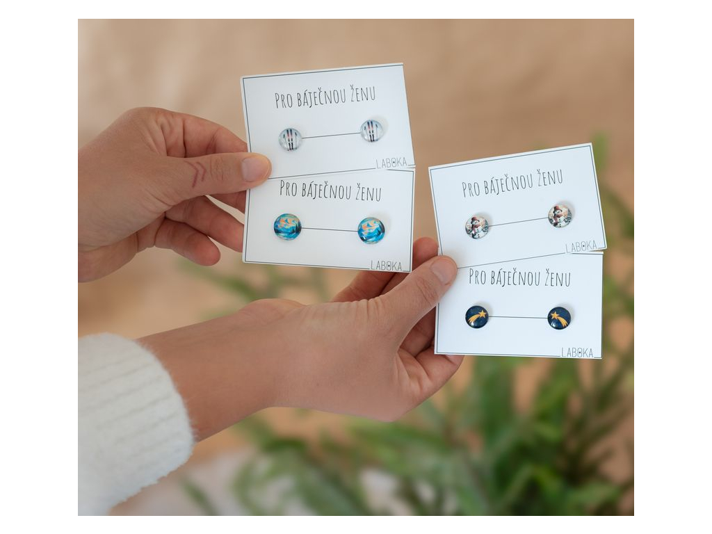 Náušnice jsou ručně vyráběné v České republice, konkrétně ve Středočeském kraji. Jsou tvořené skleněným kabošonem, pod kterým je pečlivě nalepený motiv. Puzeta, vyrobená českou firmou z chirurgické oceli 304 L, je vhodná pro většinu alergiků na kov. Na výběr máte ze tří průměrů, které si můžete zvolit. Zapínání je ze silikonové zarážky, kterou vidíte na obrázku.
