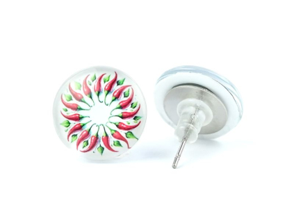 Náušnice jsou ručně vyráběné v České republice, konkrétně ve Středočeském kraji. Jsou tvořené skleněným kabošonem, pod kterým je pečlivě nalepený motiv. Puzeta, vyrobená českou firmou z chirurgické oceli 304 L, je vhodná pro většinu alergiků na kov. Na výběr máte ze dvou průměrů, které si můžete zvolit. Zapínání je ze silikonové zarážky, kterou vidíte na obrázku.