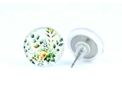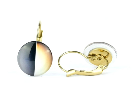 Náušnice jsou ručně vyráběné v České republice, konkrétně ve Středočeském kraji. Jsou tvořené skleněným kabošonem, pod kterým je pečlivě nalepený motiv. Puzeta, vyrobená českou firmou z chirurgické oceli 304 L, je vhodná pro většinu alergiků na kov. Na výběr máte ze dvou průměrů, které si můžete zvolit. Zapínání je ze silikonové zarážky, kterou vidíte na obrázku.