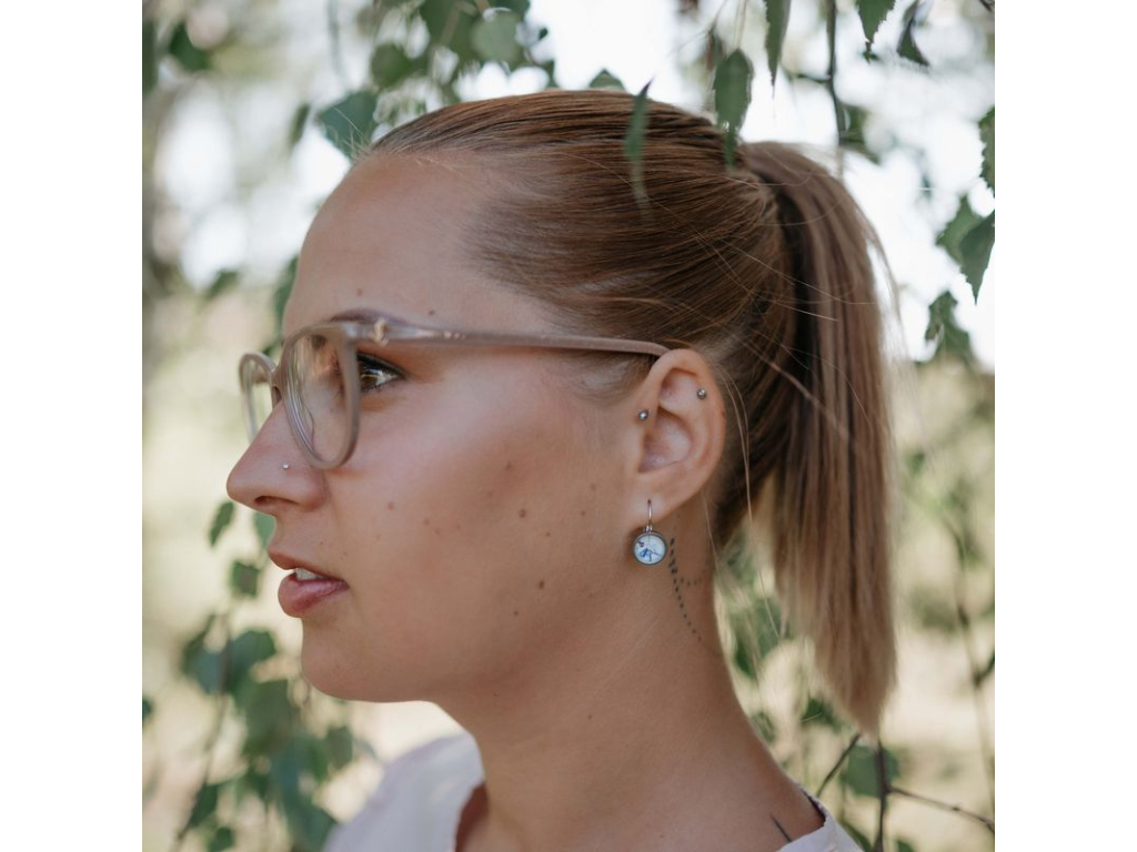 Náušnice jsou ručně vyráběné v České republice, konkrétně ve Středočeském kraji. Jsou tvořené skleněným kabošonem, pod kterým je pečlivě nalepený motiv. Háček, vyrobený českou firmou z chirurgické oceli 316 L, je vhodný pro většinu alergiků na kov.