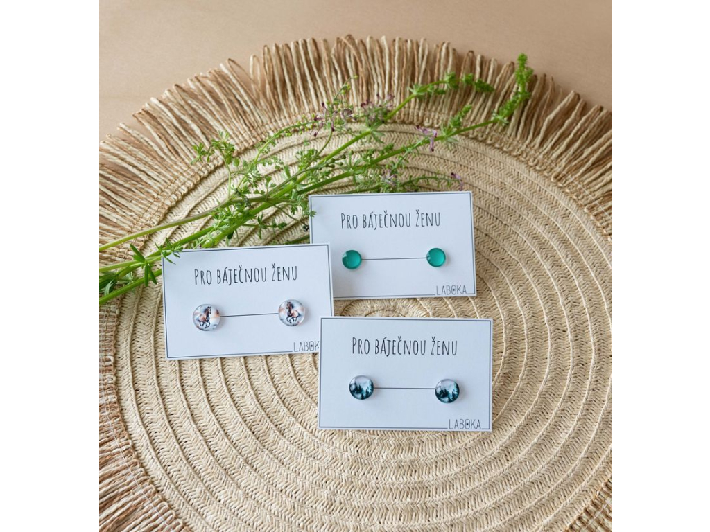Náušnice jsou ručně vyráběné v České republice, konkrétně ve Středočeském kraji. Jsou tvořené skleněným kabošonem, pod kterým je pečlivě nalepený motiv. Puzeta, vyrobená českou firmou z chirurgické oceli 304 L, je vhodná pro většinu alergiků na kov. Na výběr máte ze dvou průměrů, které si můžete zvolit. Zapínání je ze silikonové zarážky, kterou vidíte na obrázku.