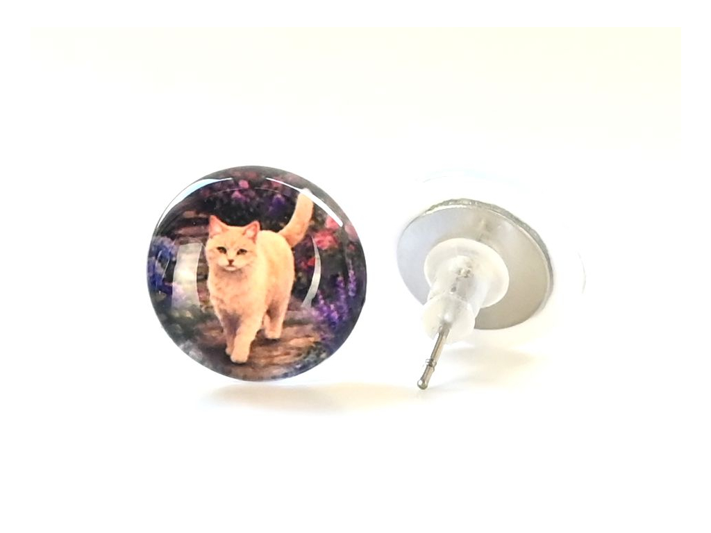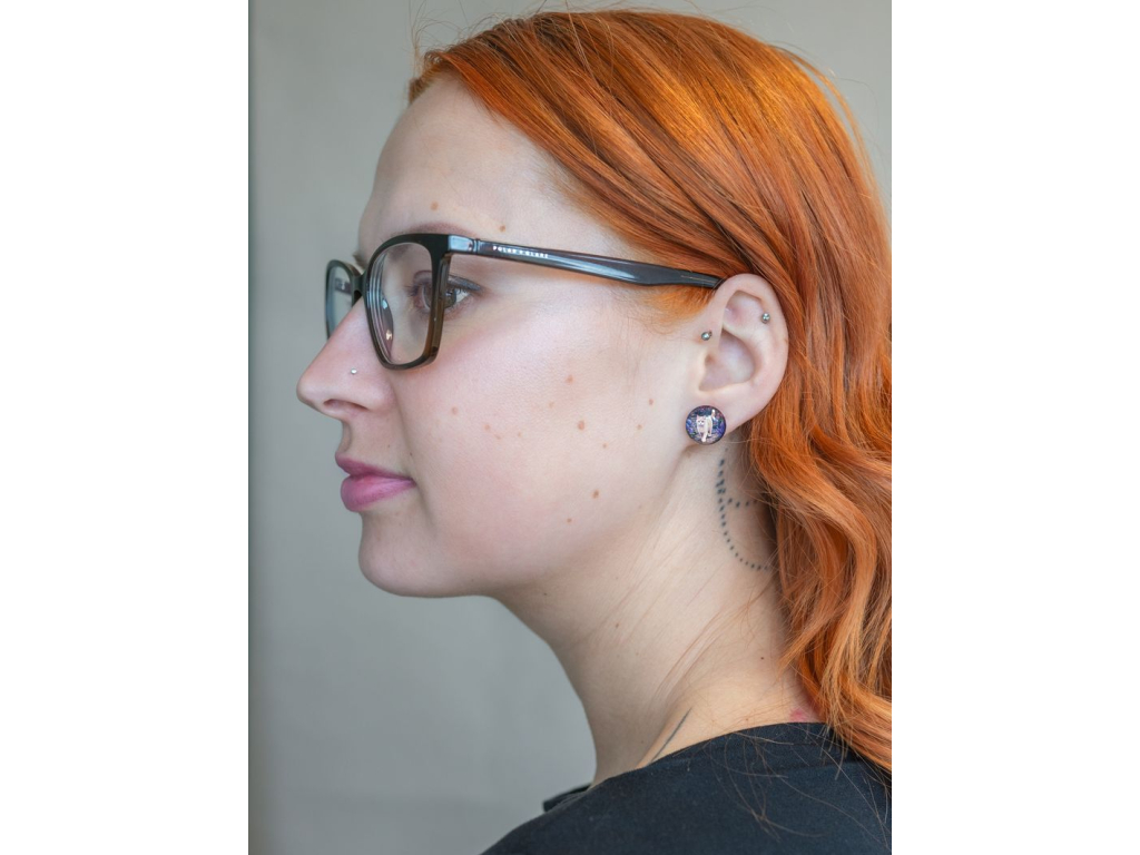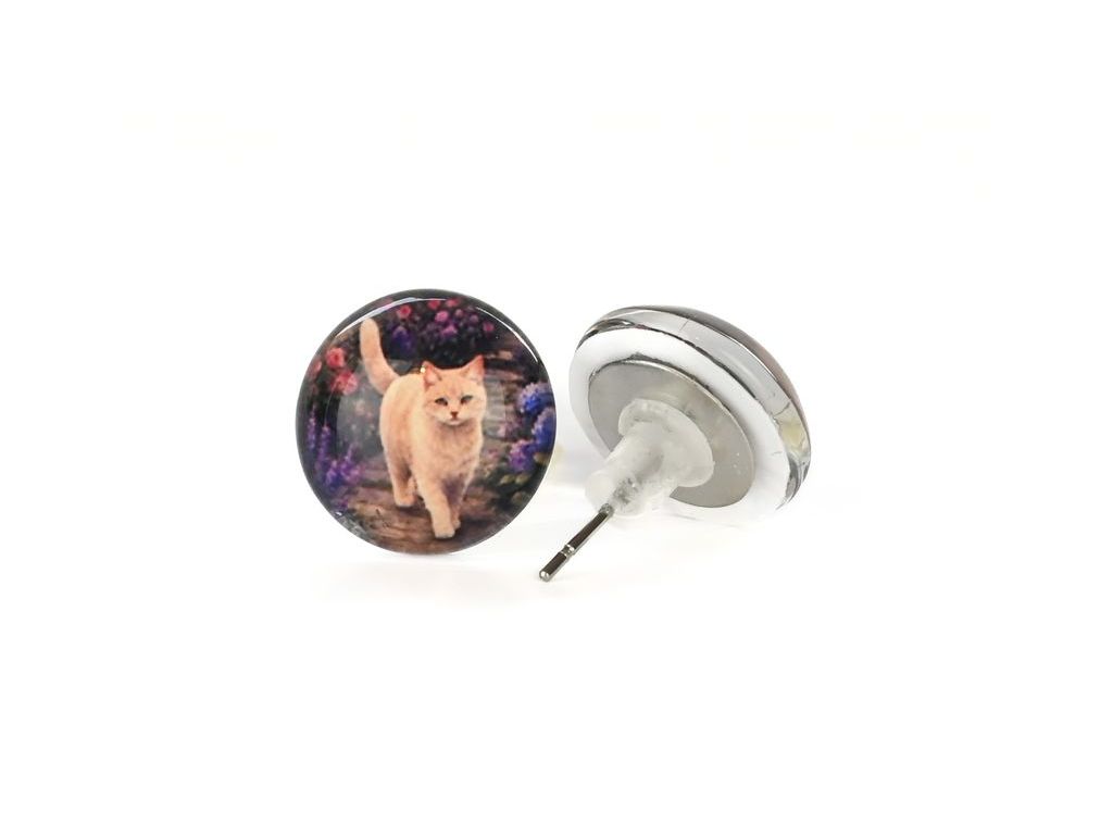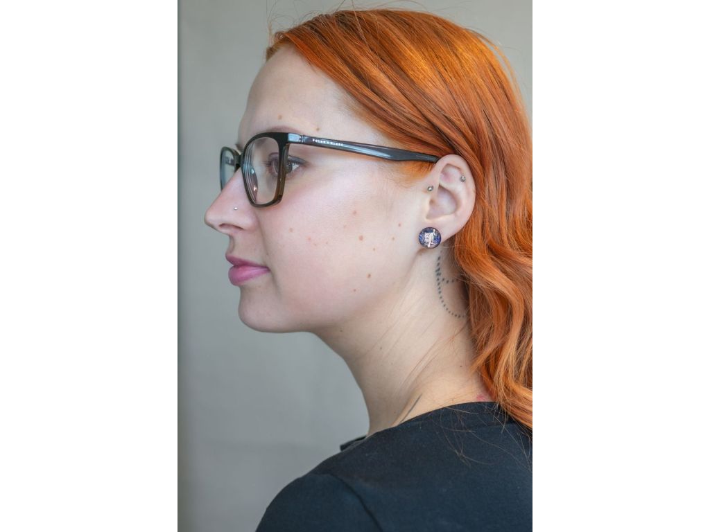 Náušnice jsou ručně vyráběné v České republice, konkrétně ve Středočeském kraji. Jsou tvořené skleněným kabošonem, pod kterým je pečlivě nalepený motiv. Puzeta, vyrobená českou firmou z chirurgické oceli 304 L, je vhodná pro většinu alergiků na kov. Na výběr máte ze dvou průměrů, které si můžete zvolit. Zapínání je ze silikonové zarážky, kterou vidíte na obrázku.