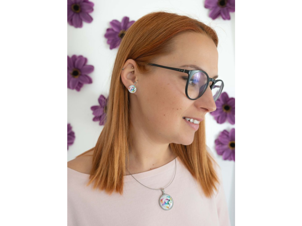 Náušnice jsou ručně vyráběné v České republice, konkrétně ve Středočeském kraji. Jsou tvořené skleněným kabošonem, pod kterým je pečlivě nalepený motiv. Puzeta, vyrobená českou firmou z chirurgické oceli 304 L, je vhodná pro většinu alergiků na kov. Na výběr máte ze dvou průměrů, které si můžete zvolit. Zapínání je ze silikonové zarážky, kterou vidíte na obrázku.