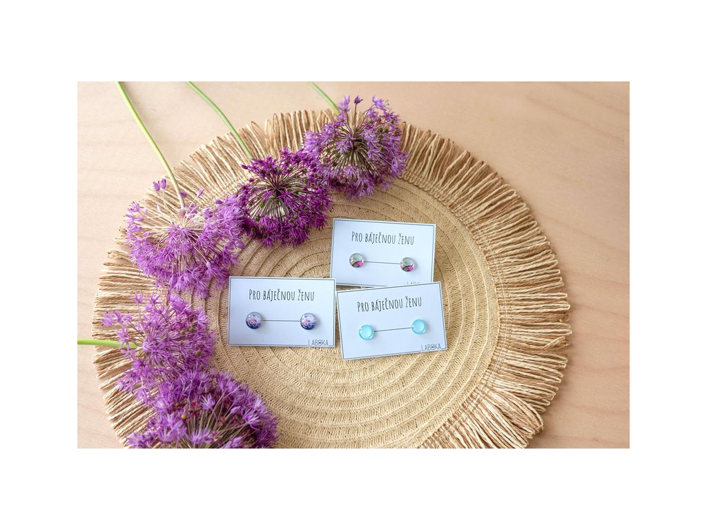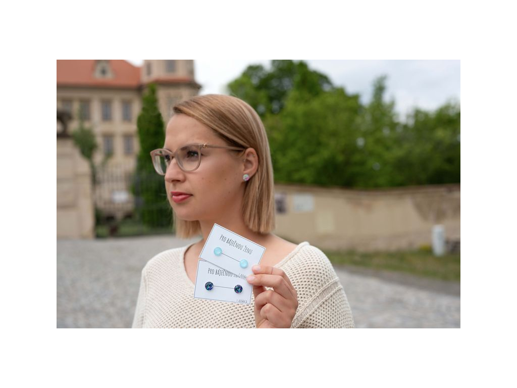 Náušnice jsou ručně vyráběné v České republice, konkrétně ve Středočeském kraji. Jsou tvořené skleněným kabošonem, pod kterým je pečlivě nalepený motiv. Puzeta, vyrobená českou firmou z chirurgické oceli 304 L, je vhodná pro většinu alergiků na kov. Na výběr máte ze tří průměrů, které si můžete zvolit. Zapínání je ze silikonové zarážky, kterou vidíte na obrázku.