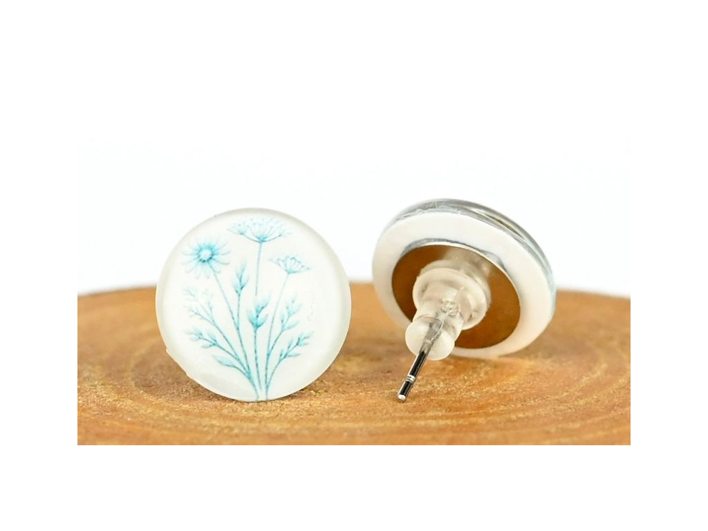 Náušnice jsou ručně vyráběné v České republice, konkrétně ve Středočeském kraji. Jsou tvořené skleněným kabošonem, pod kterým je pečlivě nalepený motiv. Puzeta, vyrobená českou firmou z chirurgické oceli 304 L, je vhodná pro většinu alergiků na kov. Na výběr máte ze dvou průměrů, které si můžete zvolit. Zapínání je ze silikonové zarážky, kterou vidíte na obrázku.