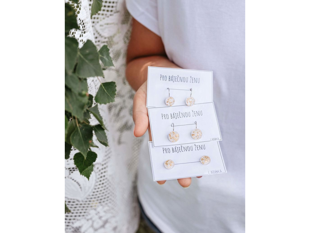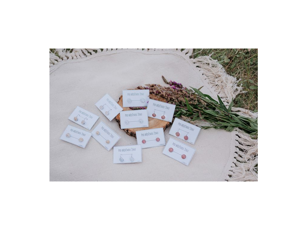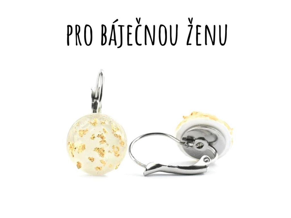 Náušnice jsou ručně vyráběné v České republice, konkrétně ve Středočeském kraji. Jsou tvořené ze skleněného kabošonu s bílým podkladem, na kterém jsou nalepené hliníkové zlaté kousky. Háček, vyrobený českou firmou z chirurgické oceli 316 L, je vhodný pro většinu alergiků na kov. Na výběr máte ze dvou průměrů, které si můžete zvolit.